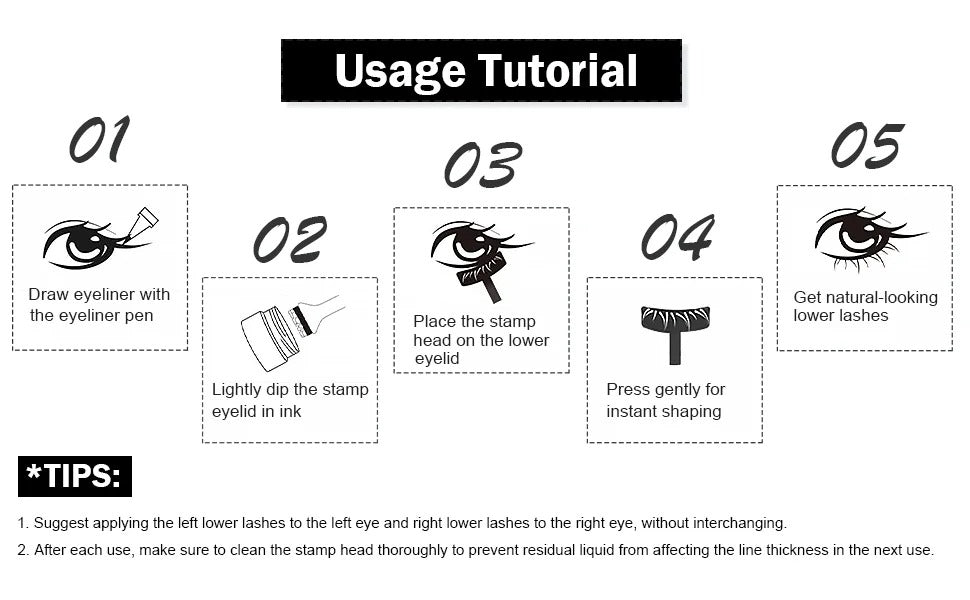 Combining eyeliners and eyelashes in one stroke, the pen’s tip easily defines eye makeup details. Its one-piece design saves time and adds convenience. Each pen includes two eyelash stamps, tailored for left and right eyes, fitting the eyes’ curvature perfectly. Achieve a natural look quickly with the lower lash stamp—just one press is needed, no repeated application necessary.