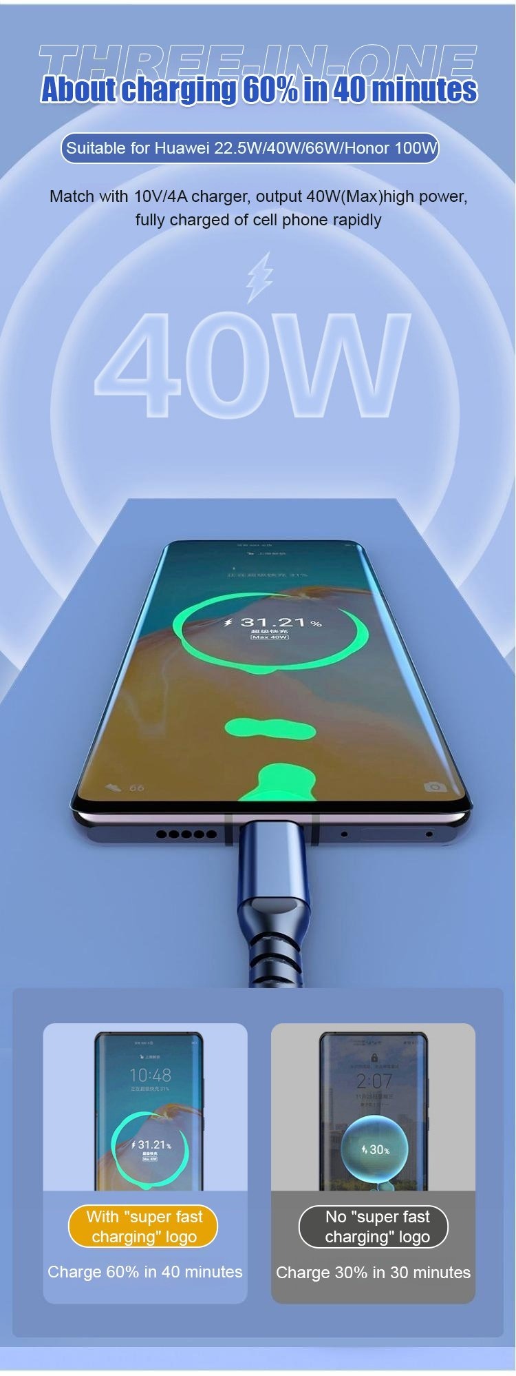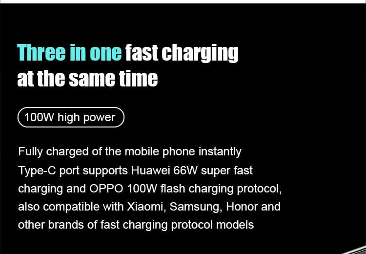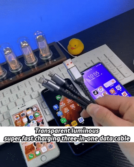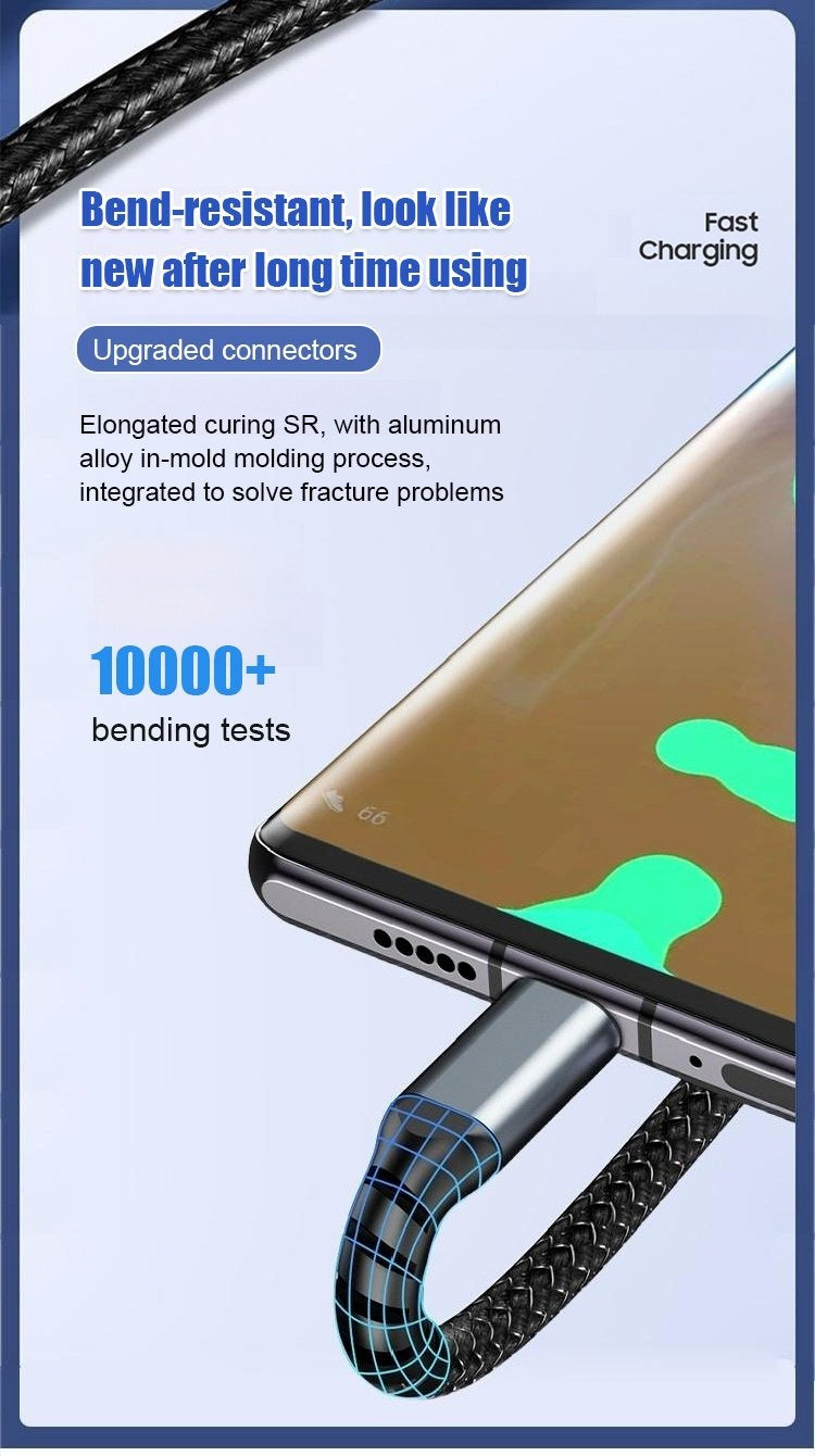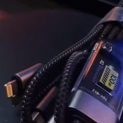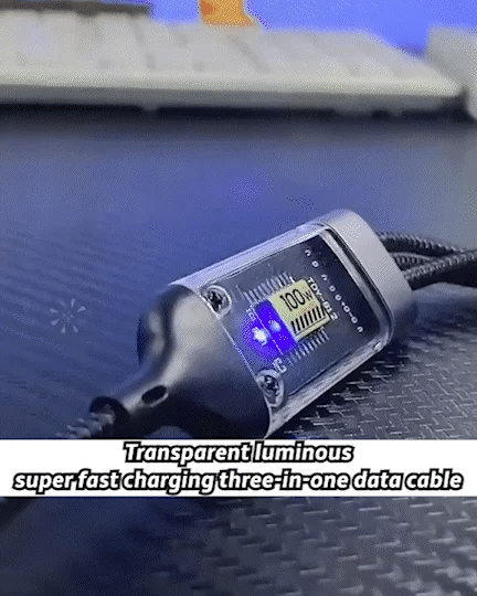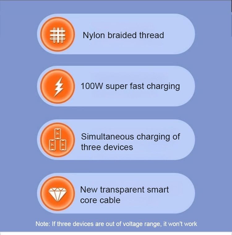 Power up multiple devices efficiently with unmatched speed and durability! This 100W fast-charging cable enables simultaneous charging of three devices, making it an ideal solution for your home, office, car, or gaming setup. Designed with a robust nylon braided exterior, it can endure over 3000 bends and swings, ensuring long-lasting reliability. The transparent smart core technology optimizes power distribution for consistent charging performance, while its sturdy construction supports weights up to 11 lbs. Stay connected and charge your devices with confidence.